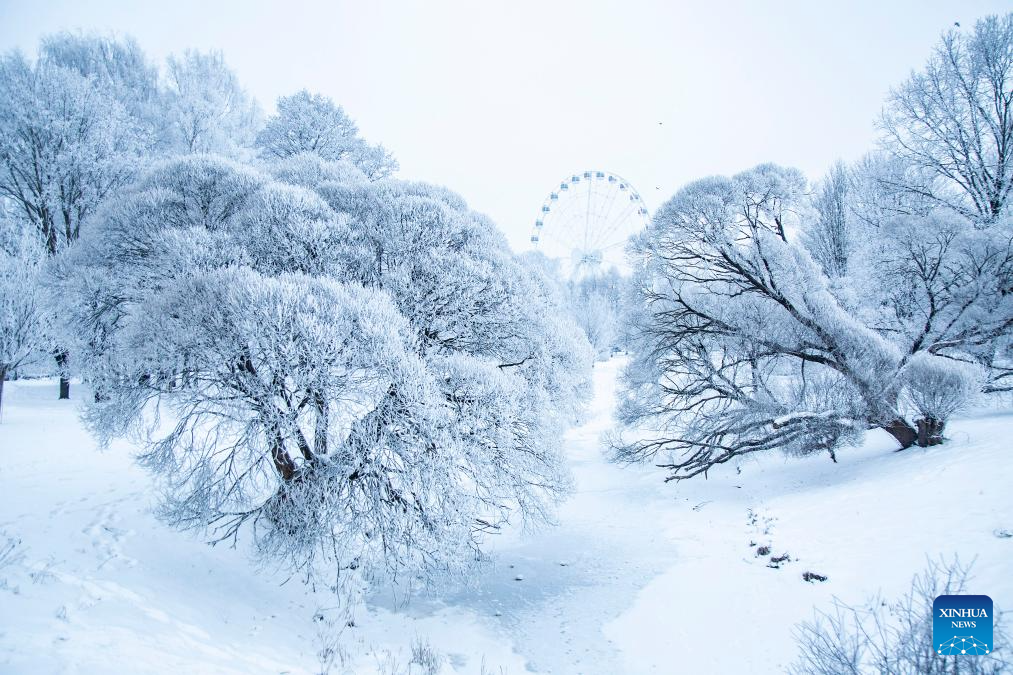 Photo taken on Jan. 21, 2026 shows rime scenery in a park in Riga, Latvia. (Photo by Edijs Palens/Xinhua)