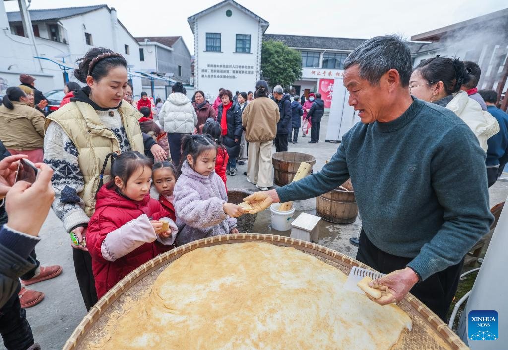 Children taste freshly made rice cakes at a farmers' fair held to welcome the Chinese Lunar New Year in Dongbaihu Town of Zhuji City, east China's Zhejiang Province, Jan. 23, 2026. (Xinhua/Xu Yu)