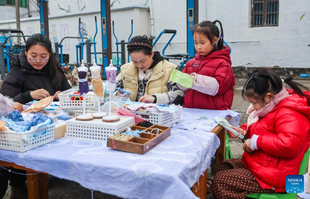 Children make handicrafts at a farmers' fair held to welcome the Chinese Lunar New Year in Dongbaihu Town of Zhuji, east China's Zhejiang Province, Jan. 23, 2026. (Xinhua/Xu Yu)