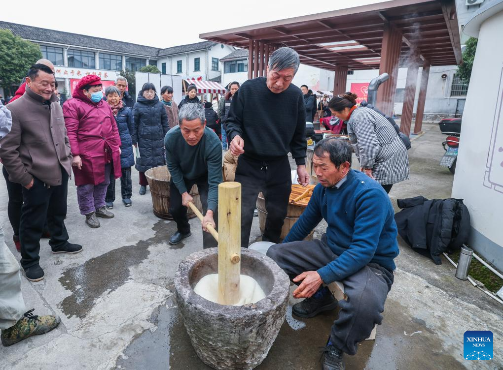 Villagers make rice cakes at a farmers' fair held to welcome the Chinese Lunar New Year in Dongbaihu Town of Zhuji, east China's Zhejiang Province, Jan. 23, 2026. (Xinhua/Xu Yu)