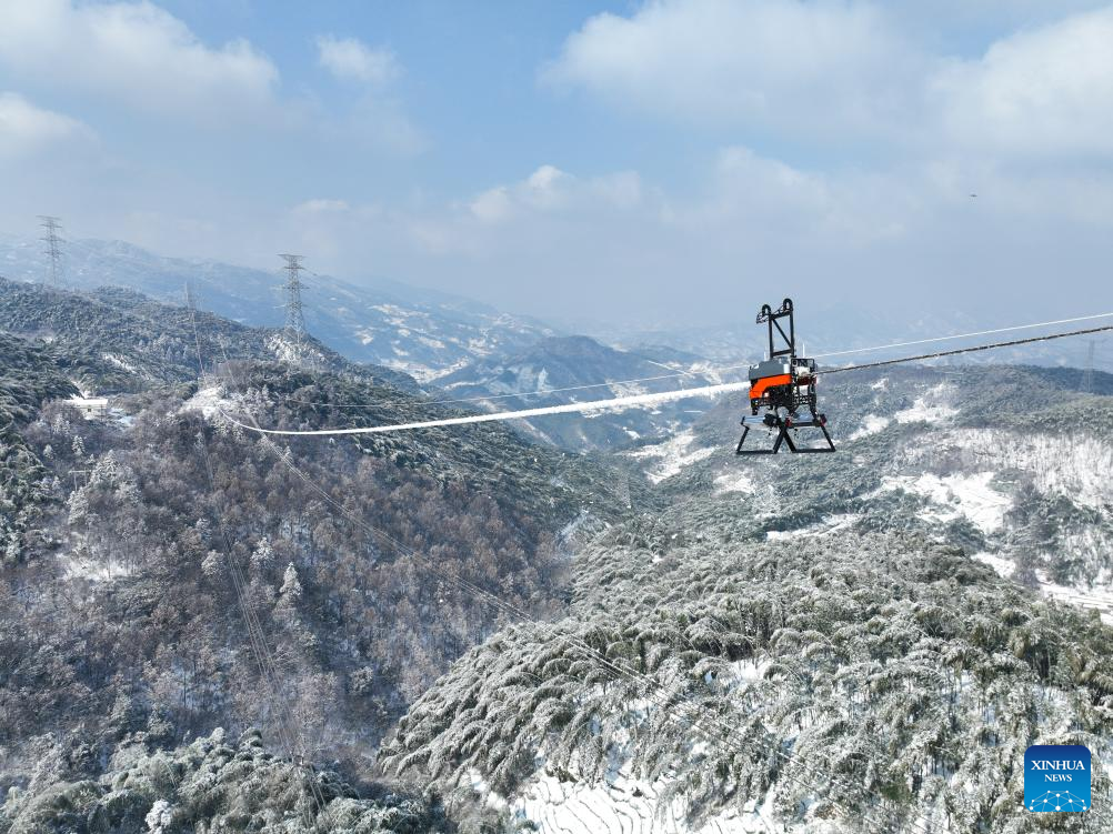 An aerial drone photo taken on Jan. 21, 2026 shows a deicing device operation on a power transmission line in Jinzhai County, east China's Anhui Province. Ice coating were observed on part of the power transmission lines in Jinzhai County as a rigid cold wave swooped down here recently, posing a threat to grid operation. (Photo by Zhao Xianfu/Xinhua)