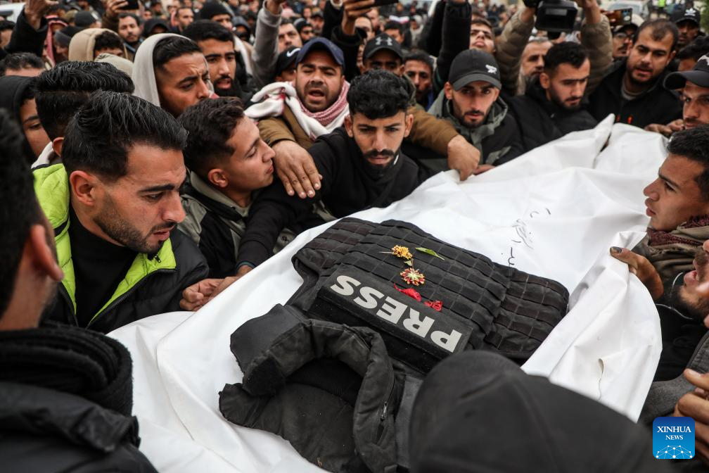 Mourners attend a funeral of three Palestinian journalists, who were killed by an Israeli airstrike on Wednesday, in the southern Gaza Strip city of Khan Younis, on Jan. 22, 2026. Eleven Palestinians were killed by Israeli fire on Wednesday across Gaza amid escalating tensions, according to Palestinian sources. (Photo by Rizek Abdeljawad/Xinhua)