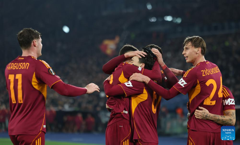 Roma's players celebrate scoring during the UEFA Europa League 2025/26 league phase match between Roma and Stuttgart of the UEFA Europa League in Rome, Italy, Jan. 22, 2026. (Xinhua/Li Jing)