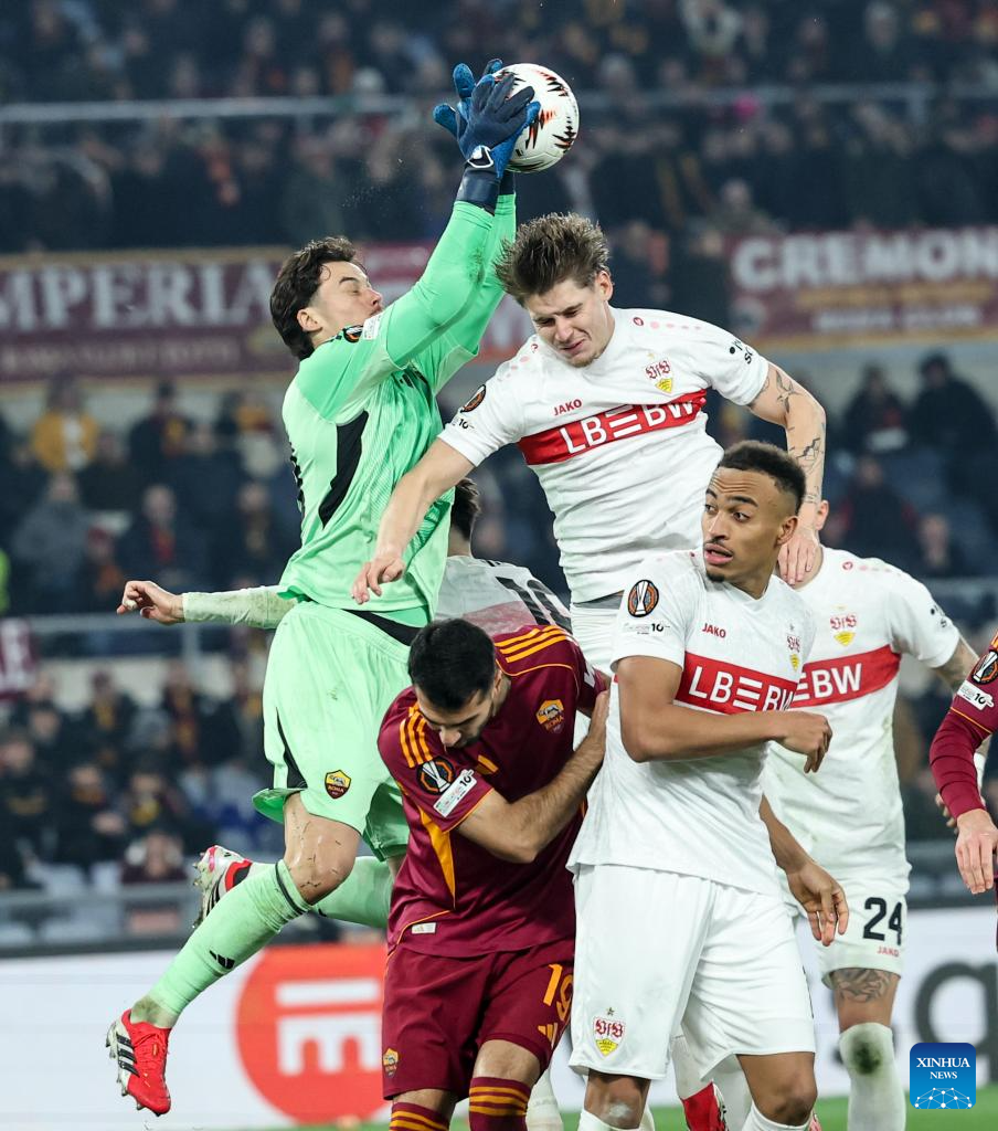 Roma's goalkeeper Mile Svilar (Top L) blocks during the UEFA Europa League 2025/26 league phase match between Roma and Stuttgart of the UEFA Europa League in Rome, Italy, Jan. 22, 2026. (Xinhua/Li Jing)