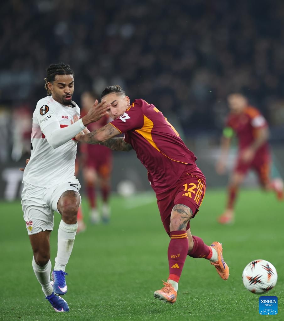 Roma's Daniele Ghilardi (L) vies with Stuttgart's Jamie Leweling during the UEFA Europa League 2025/26 league phase match between Roma and Stuttgart of the UEFA Europa League in Rome, Italy, Jan. 22, 2026. (Xinhua/Li Jing)