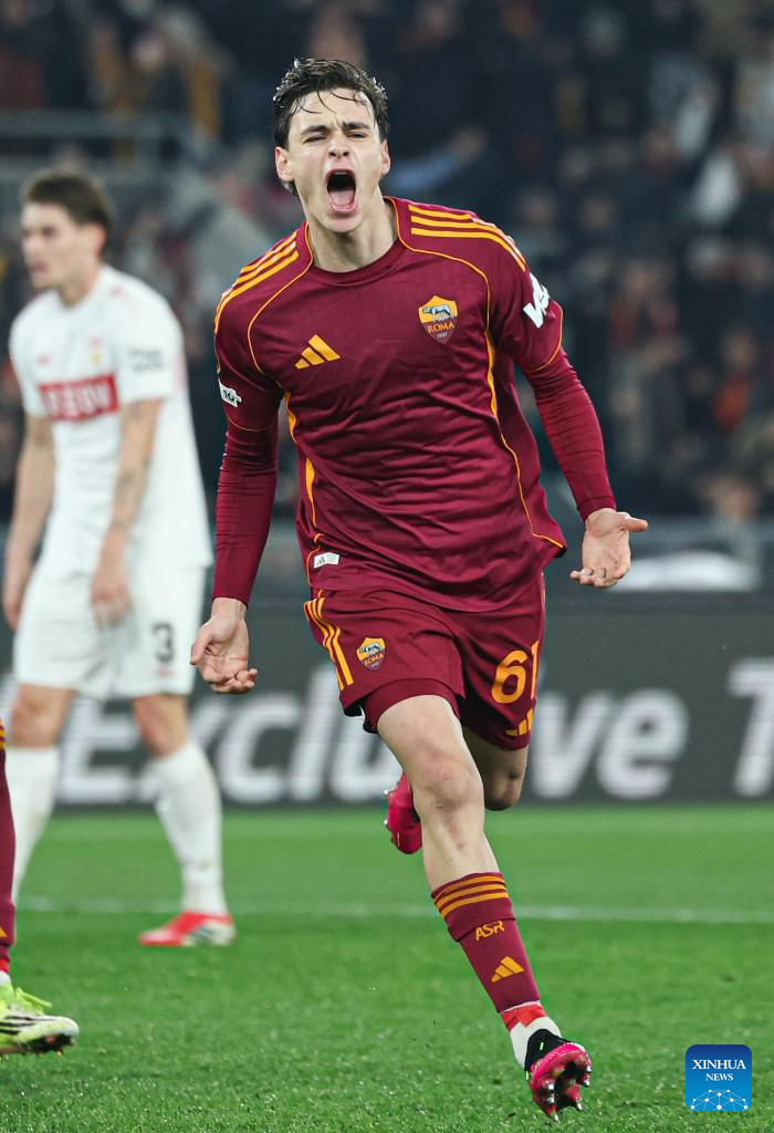 Roma's Niccolo Pisilli celebrates his first goal during the UEFA Europa League 2025/26 league phase match between Roma and Stuttgart of the UEFA Europa League in Rome, Italy, Jan. 22, 2026. (Xinhua/Li Jing)