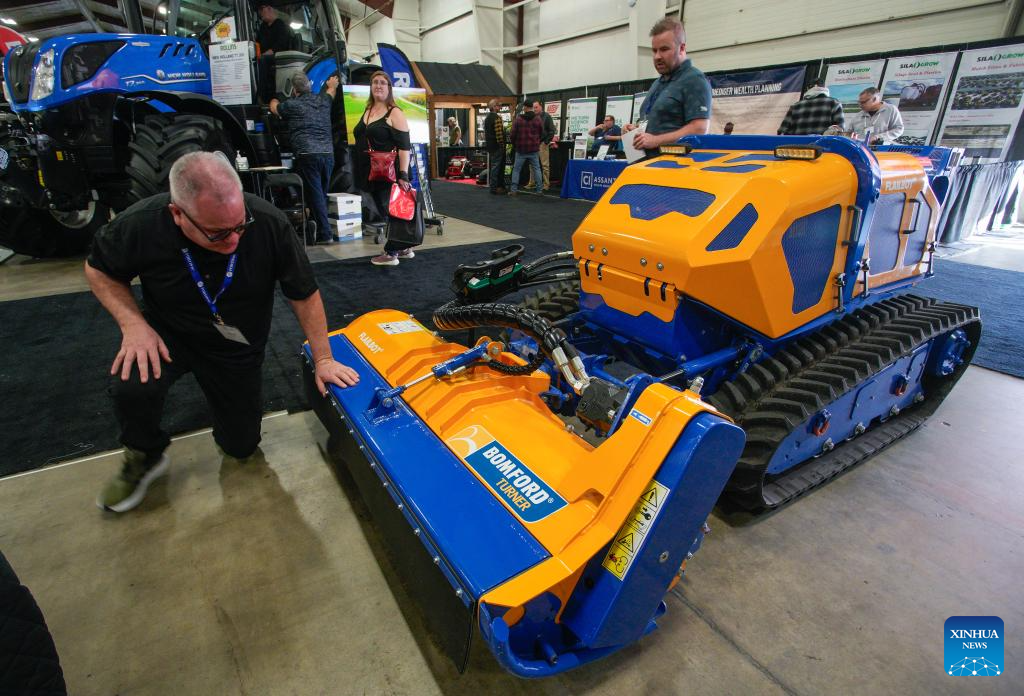 A man looks at a remote-controlled mower at the 2026 Pacific Agriculture Show in Abbotsford, British Columbia, Canada, Jan. 22, 2026. The event kicked off here on Thursday and runs until Jan. 24. (Photo by Liang Sen/Xinhua)