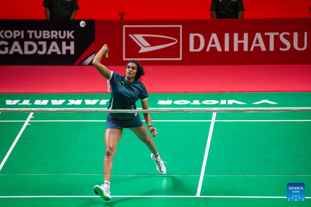 Pusarla V. Sindhu of India hits a return during the women's singles quarterfinal match between Chen Yufei of China and Pusarla V. Sindhu of India at the Indonesia Masters 2026 badminton tournament in Jakarta, Indonesia, Jan. 23, 2026. (Xinhua/Veri Sanovri)