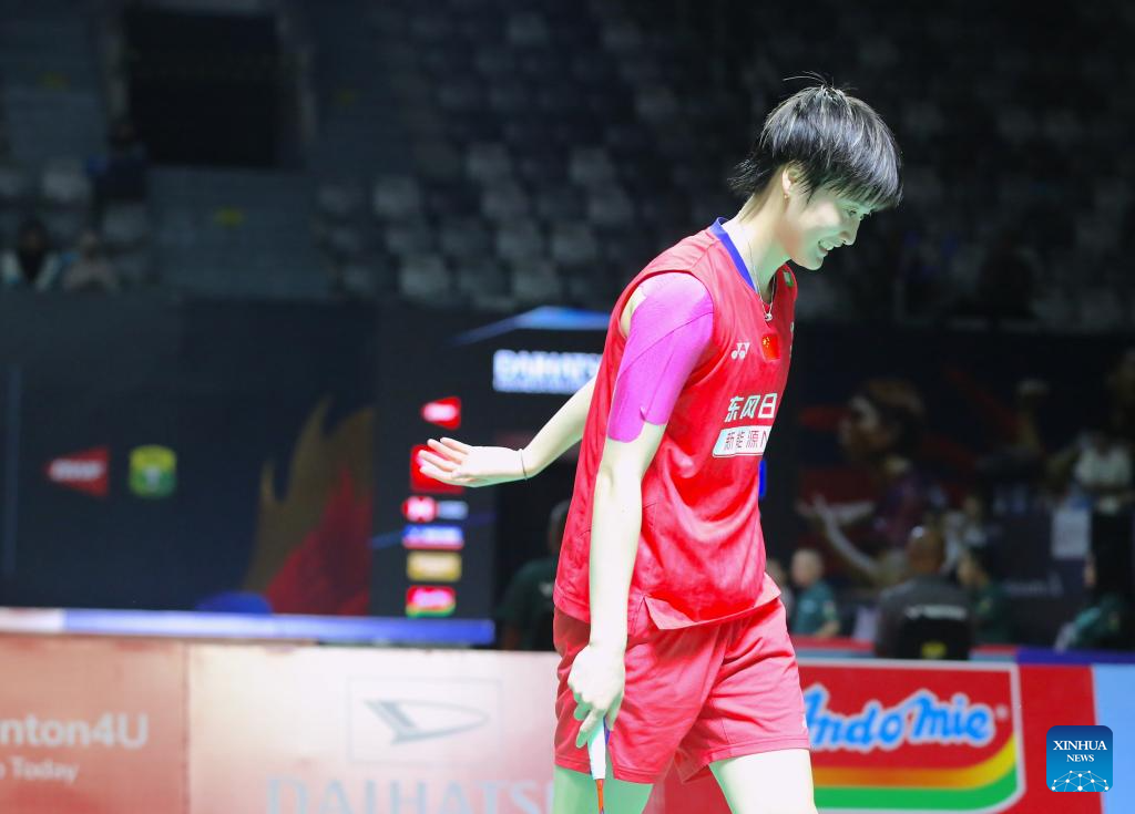 Chen Yufei of China celebrates scoring during the women's singles quarterfinal match between Chen Yufei of China and Pusarla V. Sindhu of India at the Indonesia Masters 2026 badminton tournament in Jakarta, Indonesia, Jan. 23, 2026. (Xinhua/Veri Sanovri)