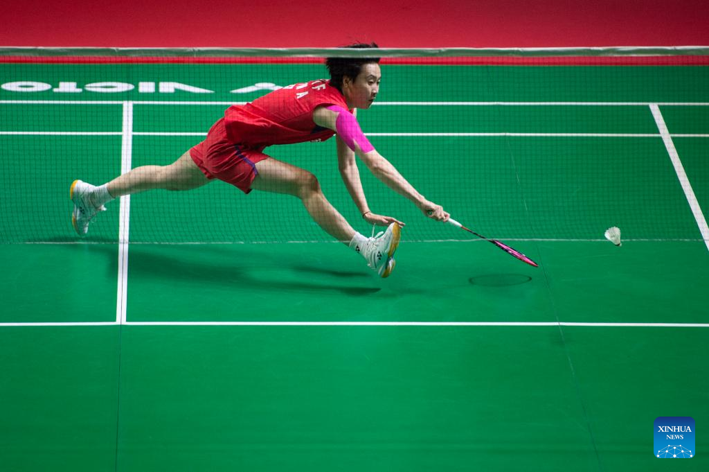 Chen Yufei of China hits a return during the women's singles quarterfinal match between Chen Yufei of China and Pusarla V. Sindhu of India at the Indonesia Masters 2026 badminton tournament in Jakarta, Indonesia, Jan. 23, 2026. (Xinhua/Veri Sanovri)