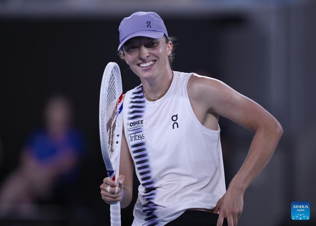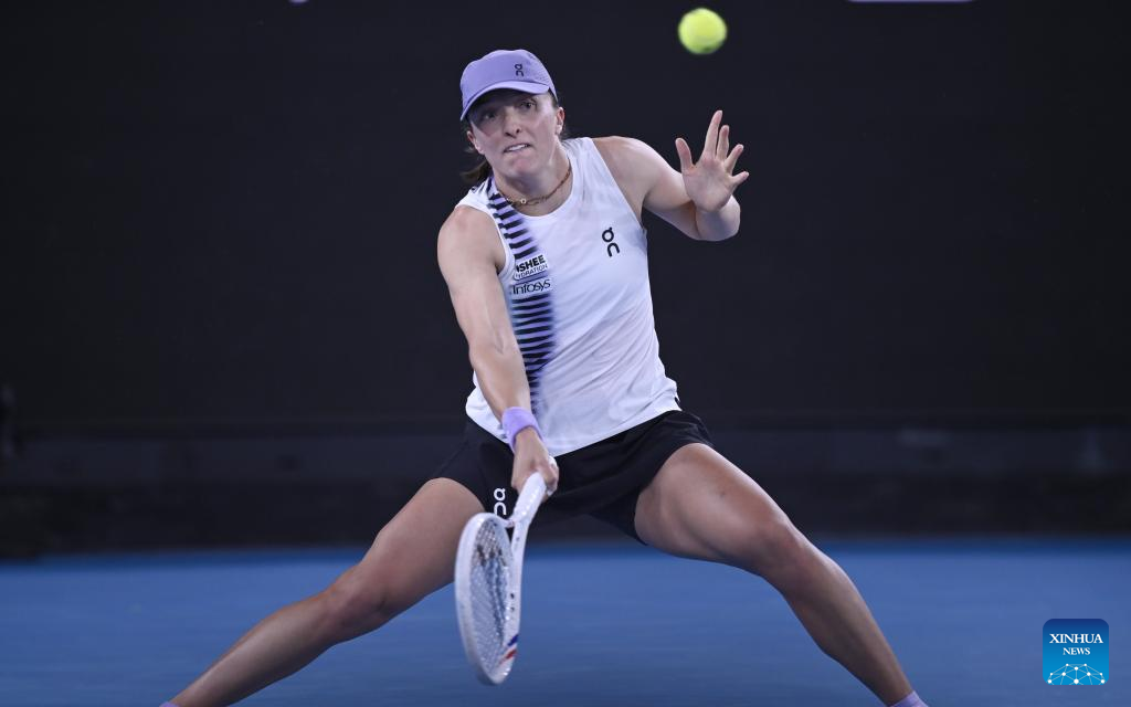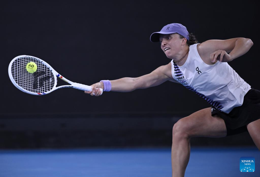 MELBOURNE, Jan. 24 (Xinhua) -- World number two Iga Swiatek overcame a second set catastrophe on Saturday to beat 31st seed Anna Kalinskaya in the Australian Open third round.