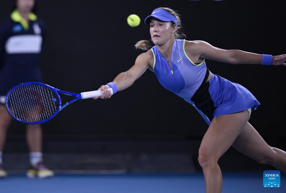 Anna Kalinskaya hits a return during the women's singles 3rd round match between Iga Swiatek of Poland and Anna Kalinskaya of Russia at the Australian Open tennis tournament in Melbourne, Australia, Jan. 24, 2026. (Photo by Wang Shen/Xinhua)