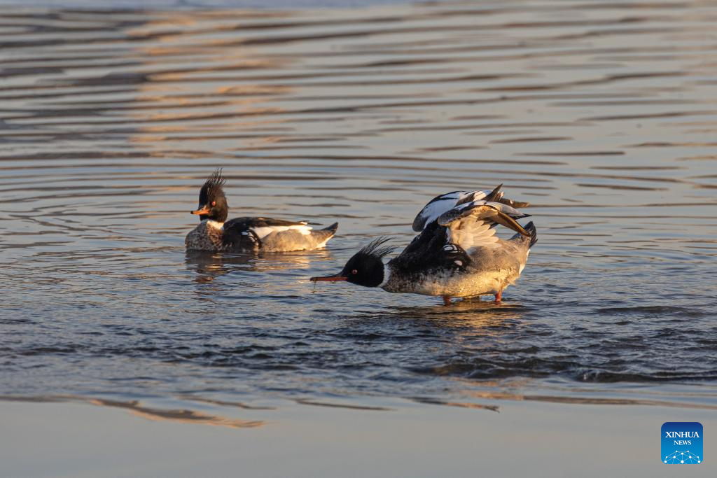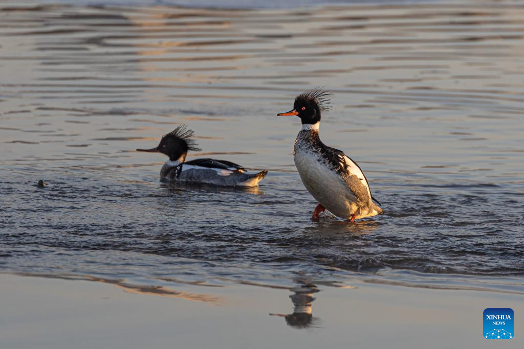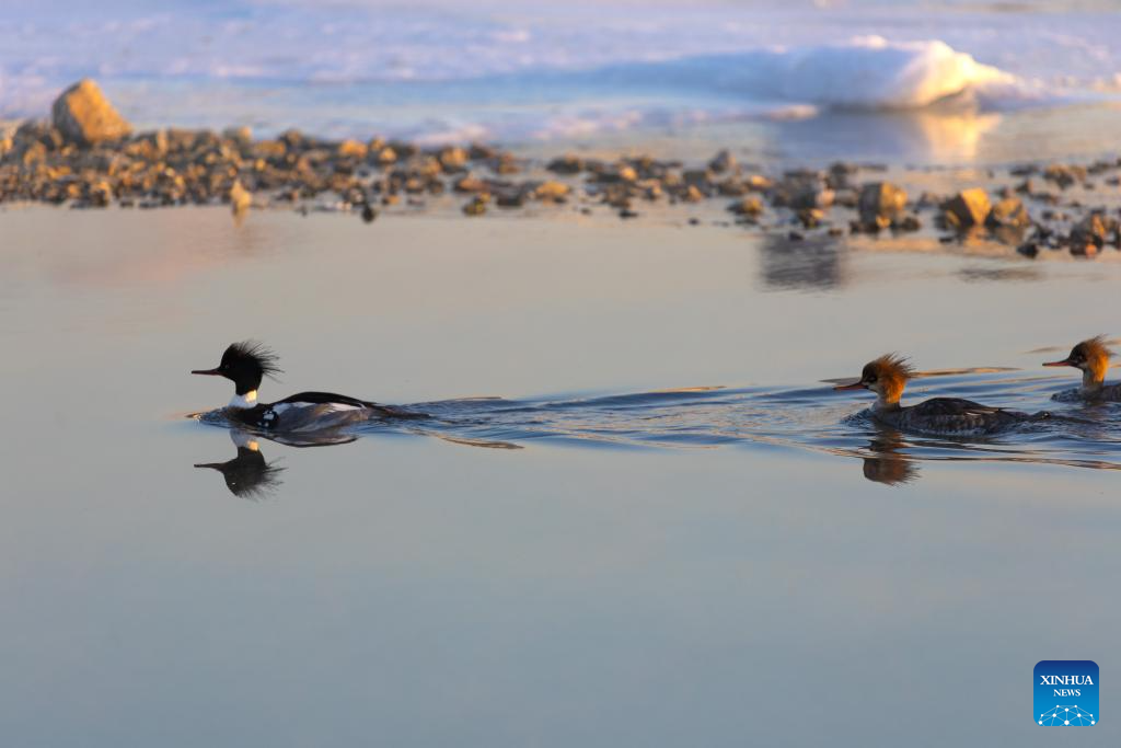 This photo taken on Jan. 23, 2026 shows mergansers in the waters of Vladivostok, Russia. Some birds spend the winter in the unfrozen waters of Vladivostok. (Photo by Andrey Matveenko/Xinhua)