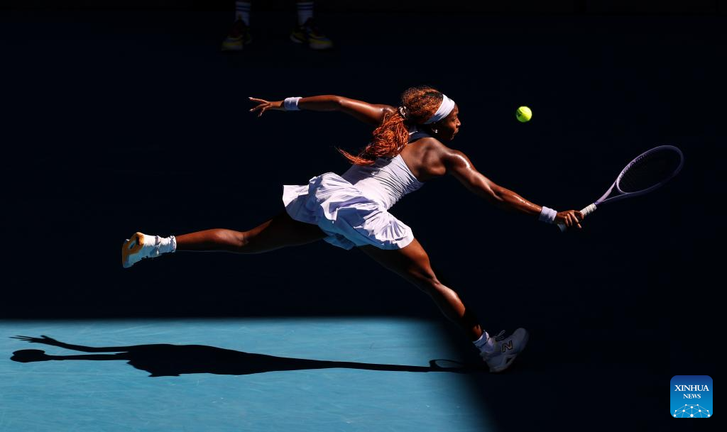Coco Gauff of the United States hits a return during the women's singles 3rd round match against Hailey Baptiste of the United States at the Australian Open tennis tournament in Melbourne, Australia, Jan. 23, 2026. (Xinhua/Ma Ping)