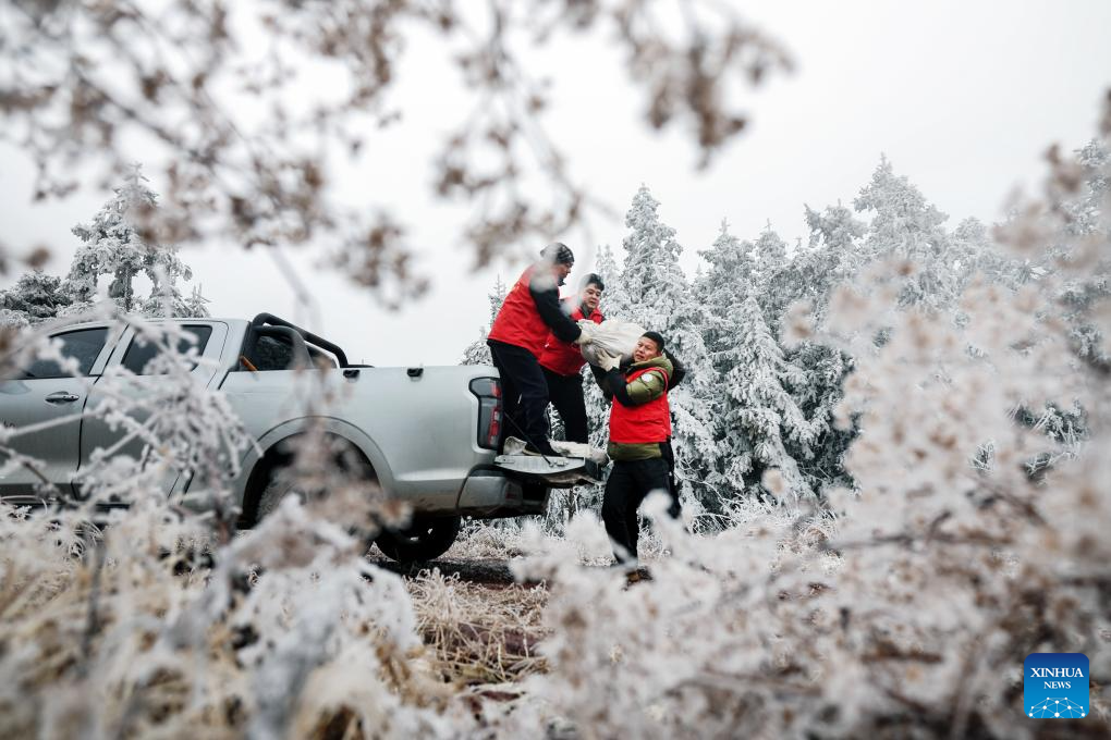 Government workers deliver supplies to local residents as cold waves hit Haiyang Town, Lingchuan County, south China's Guangxi Zhuang Autonomous Region, Jan. 22, 2026. (Photo by Liu Jiaoqing/Xinhua)