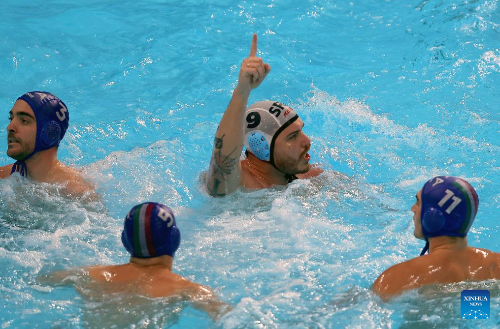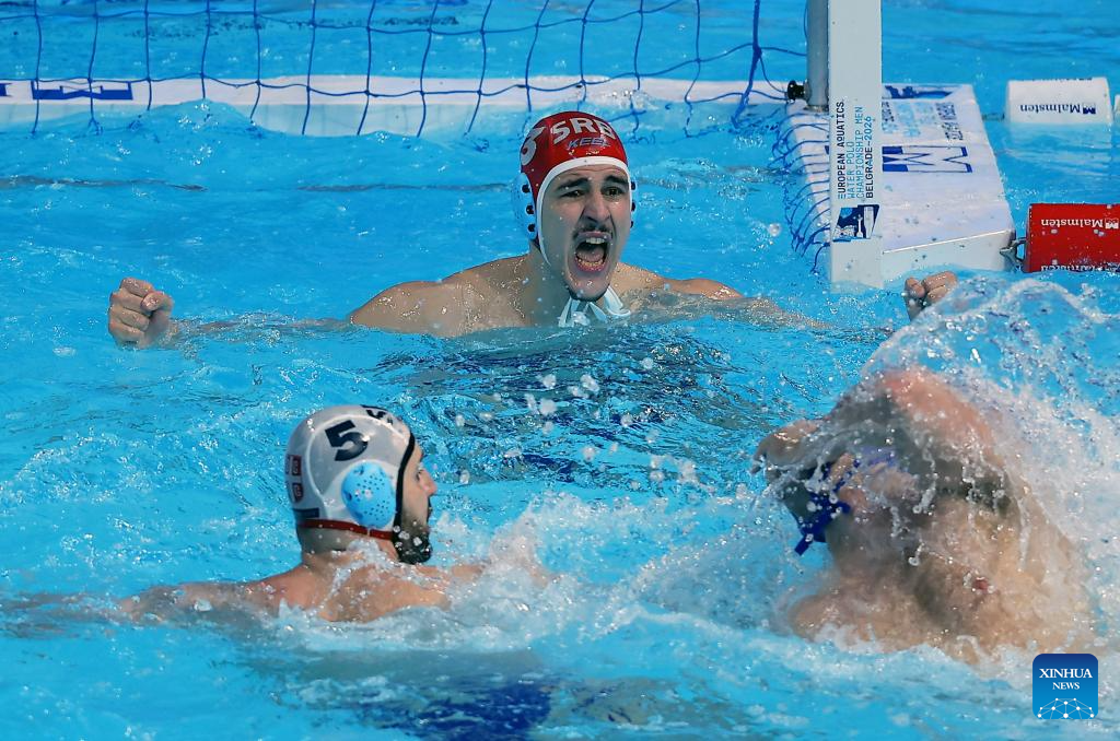 Serbia's Nemanja Vico (2nd R) celebrates a goal during the semi-final between Serbia and Italy at the Men's European Water Polo Championships in Belgrade, Serbia, Jan. 23, 2026. (Photo by Predrag Milosavljevic/Xinhua)