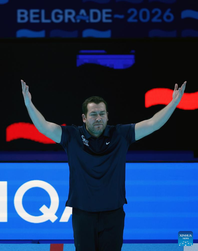Serbia's head coach Uros Stevanovic gestures during the semi-final between Serbia and Italy at the Men's European Water Polo Championships in Belgrade, Serbia, Jan. 23, 2026. (Photo by Predrag Milosavljevic/Xinhua)