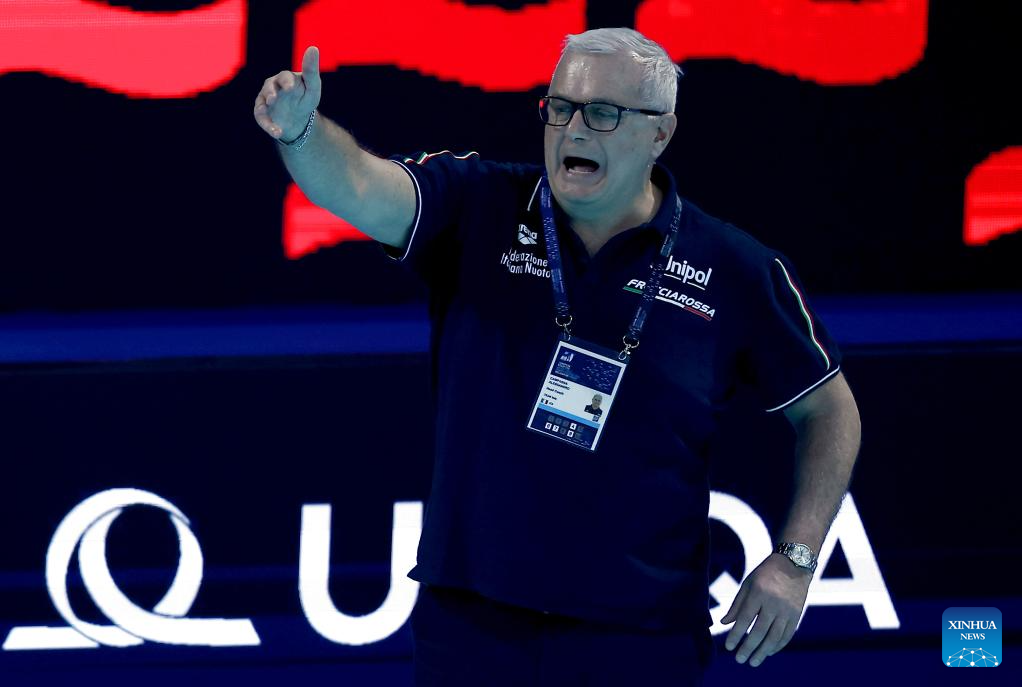 Italy's head coach Alessandro Campagna gestures during the semi-final between Serbia and Italy at the Men's European Water Polo Championships in Belgrade, Serbia, Jan. 23, 2026. (Photo by Predrag Milosavljevic/Xinhua)