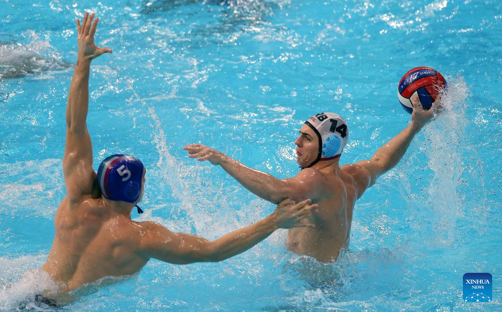 Serbia's Vasilije Martinovic (R) competes against Italy's Filippo Ferrero during the semi-final between Serbia and Italy at the Men's European Water Polo Championships in Belgrade, Serbia, Jan. 23, 2026. (Photo by Predrag Milosavljevic/Xinhua)