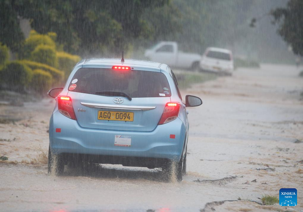 A car drives in heavy rain in Harare, Zimbabwe, Jan. 24, 2026. Persistent rains have battered large parts of Zimbabwe in recent months, leaving more than 70 people dead and causing extensive damage to road infrastructure. (Str/Xinhua)