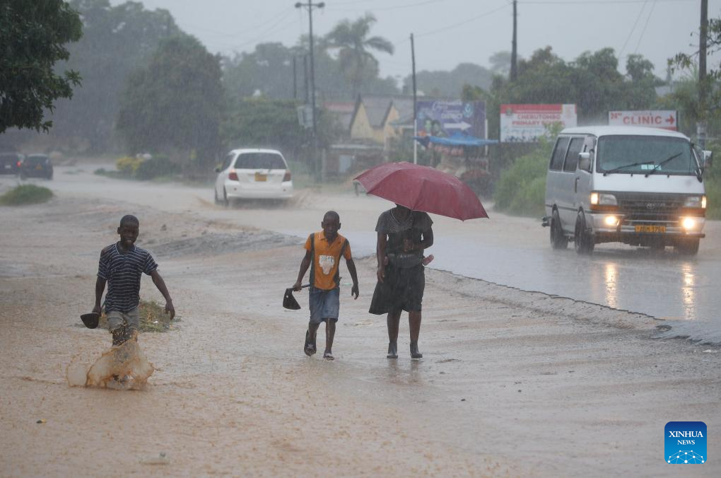 People walk in heavy rain in Harare, Zimbabwe, Jan. 24, 2026. Persistent rains have battered large parts of Zimbabwe in recent months, leaving more than 70 people dead and causing extensive damage to road infrastructure. (Str/Xinhua)