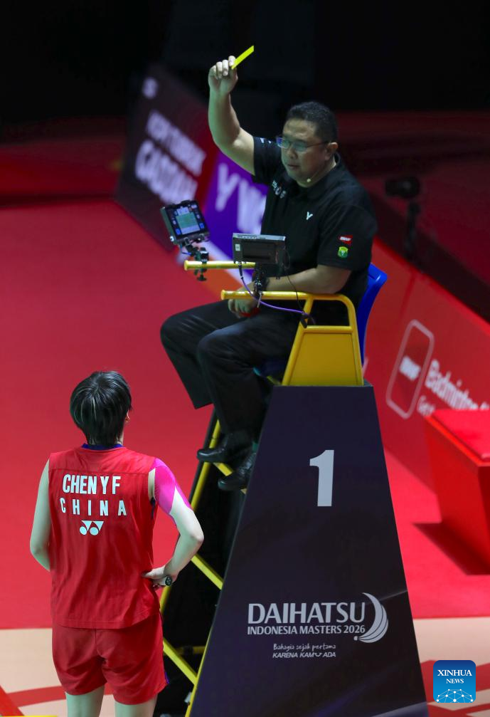Chen Yufei (L) of China receives a yellow card from the referee during the women's singles semifinal match against Okuhara Nozomi of Japan at the Indonesia Masters 2026 badminton tournament in Jakarta, Indonesia, Jan. 24, 2026. (Xinhua/Cen Yunpeng)