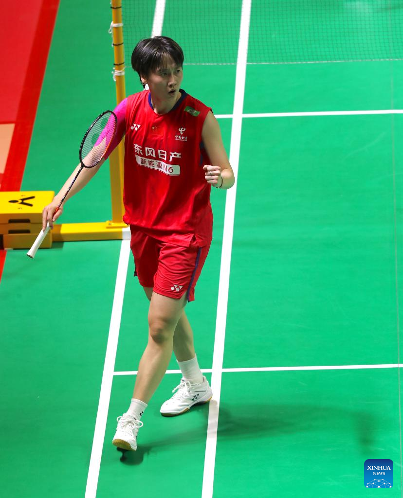 Chen Yufei of China celebrates after scoring during the women's singles semifinal match against Okuhara Nozomi of Japan at the Indonesia Masters 2026 badminton tournament in Jakarta, Indonesia, Jan. 24, 2026. (Xinhua/Cen Yunpeng)