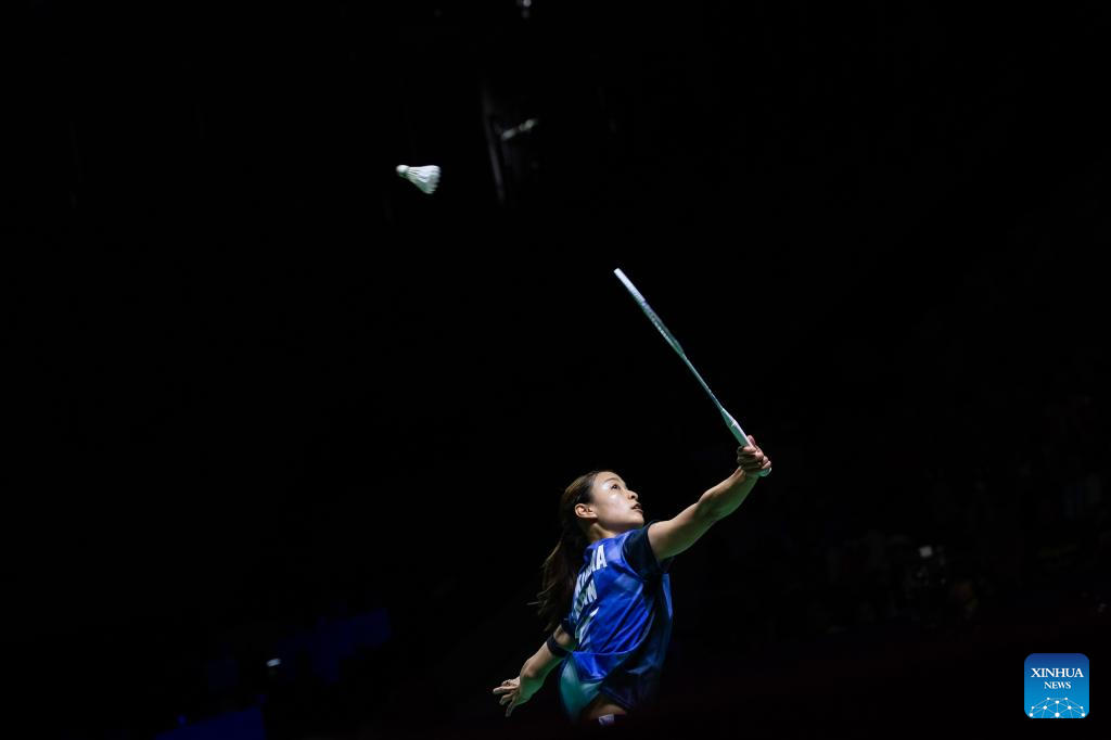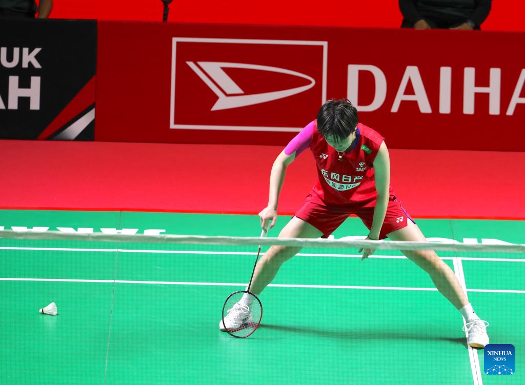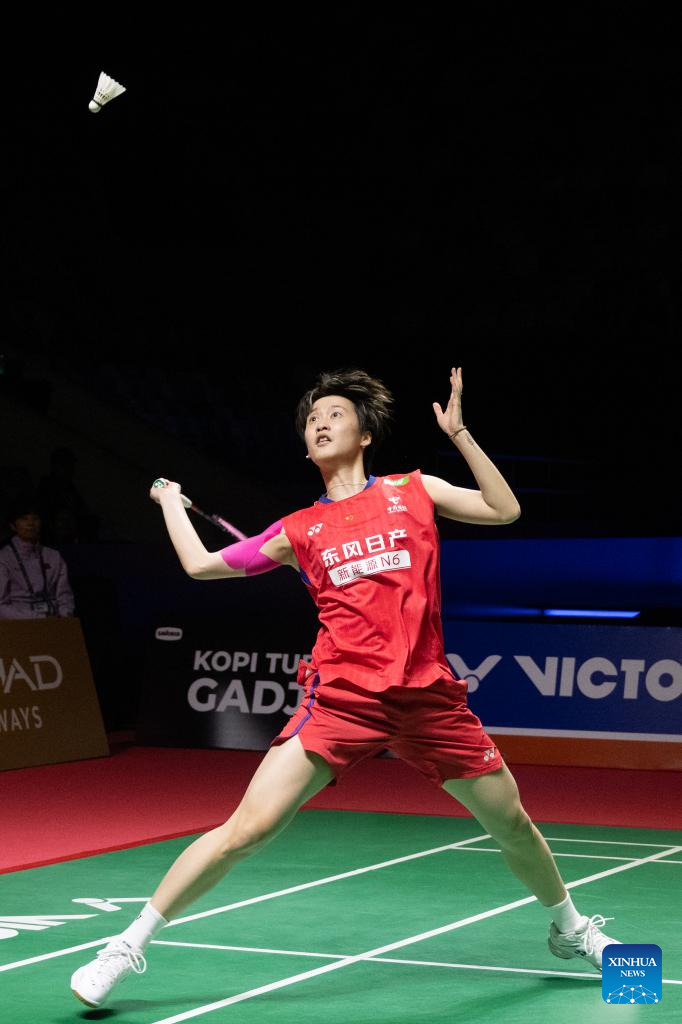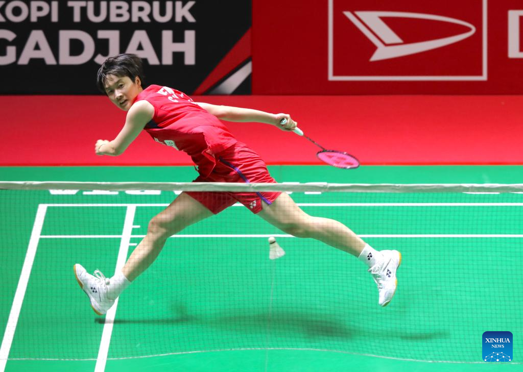 Chen Yufei of China competes during the women's singles semifinal match against Okuhara Nozomi of Japan at the Indonesia Masters 2026 badminton tournament in Jakarta, Indonesia, Jan. 24, 2026. (Xinhua/Cen Yunpeng)