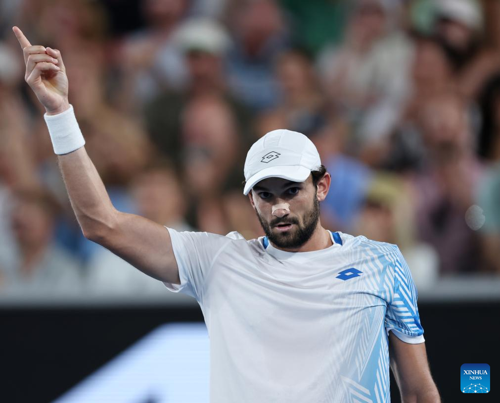 Valentin Vacherot of Monaco celebrates after scoring during the men's singles 3rd round match against Ben Shelton of the United States at the Australian Open 2026 tennis tournament in Melbourne, Australia, Jan. 24, 2026. (Xinhua/Ma Ping)