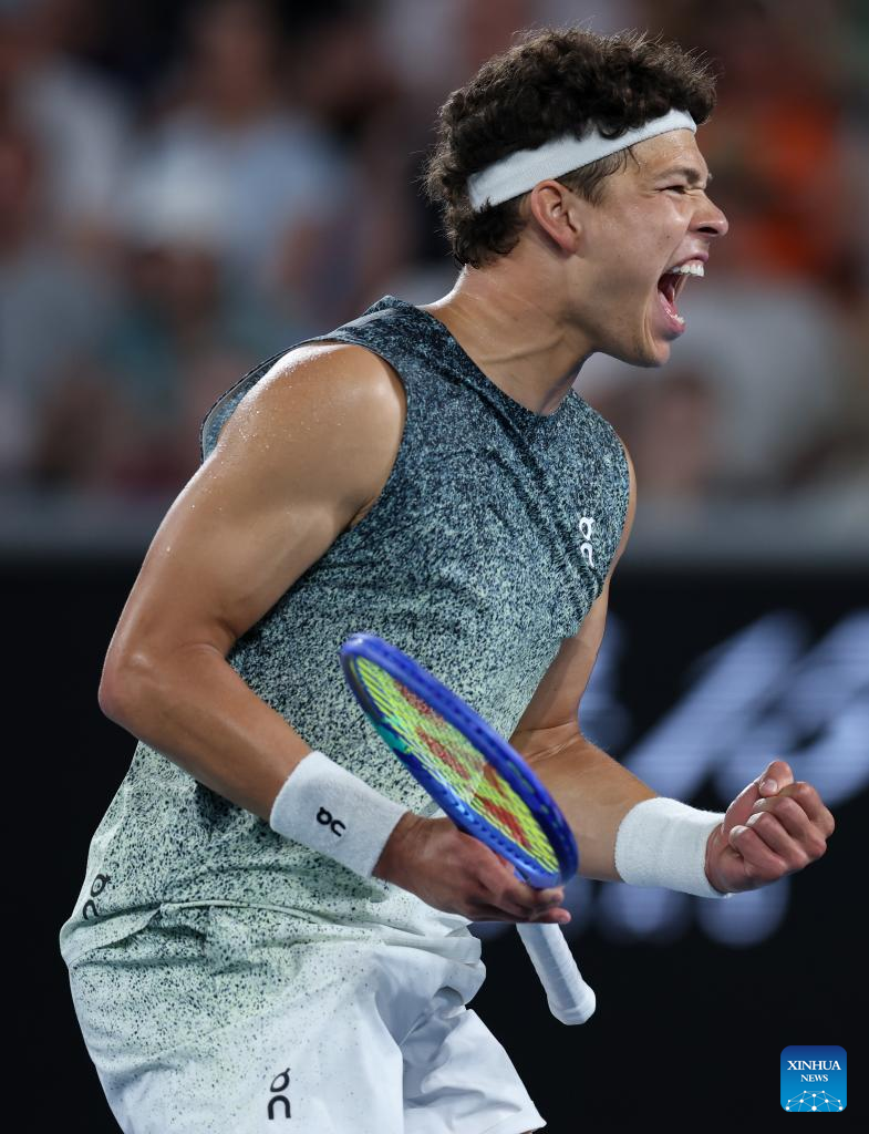 Ben Shelton of the United States celebrates after winning the men's singles 3rd round match against Valentin Vacherot of Monaco at the Australian Open 2026 tennis tournament in Melbourne, Australia, Jan. 24, 2026. (Xinhua/Ma Ping)