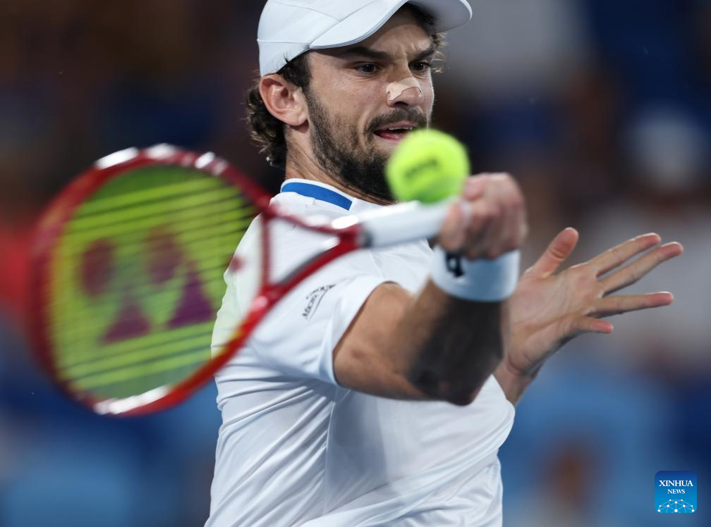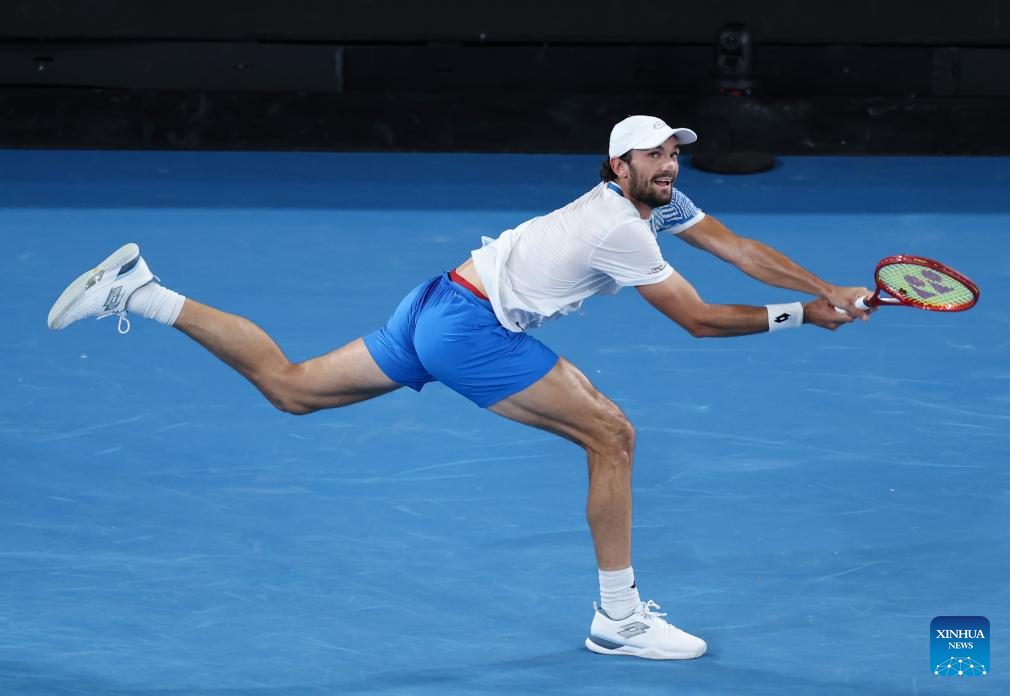 Valentin Vacherot of Monaco hits a return during the men's singles 3rd round match against Ben Shelton of the United States at the Australian Open 2026 tennis tournament in Melbourne, Australia, Jan. 24, 2026. (Xinhua/Ma Ping)