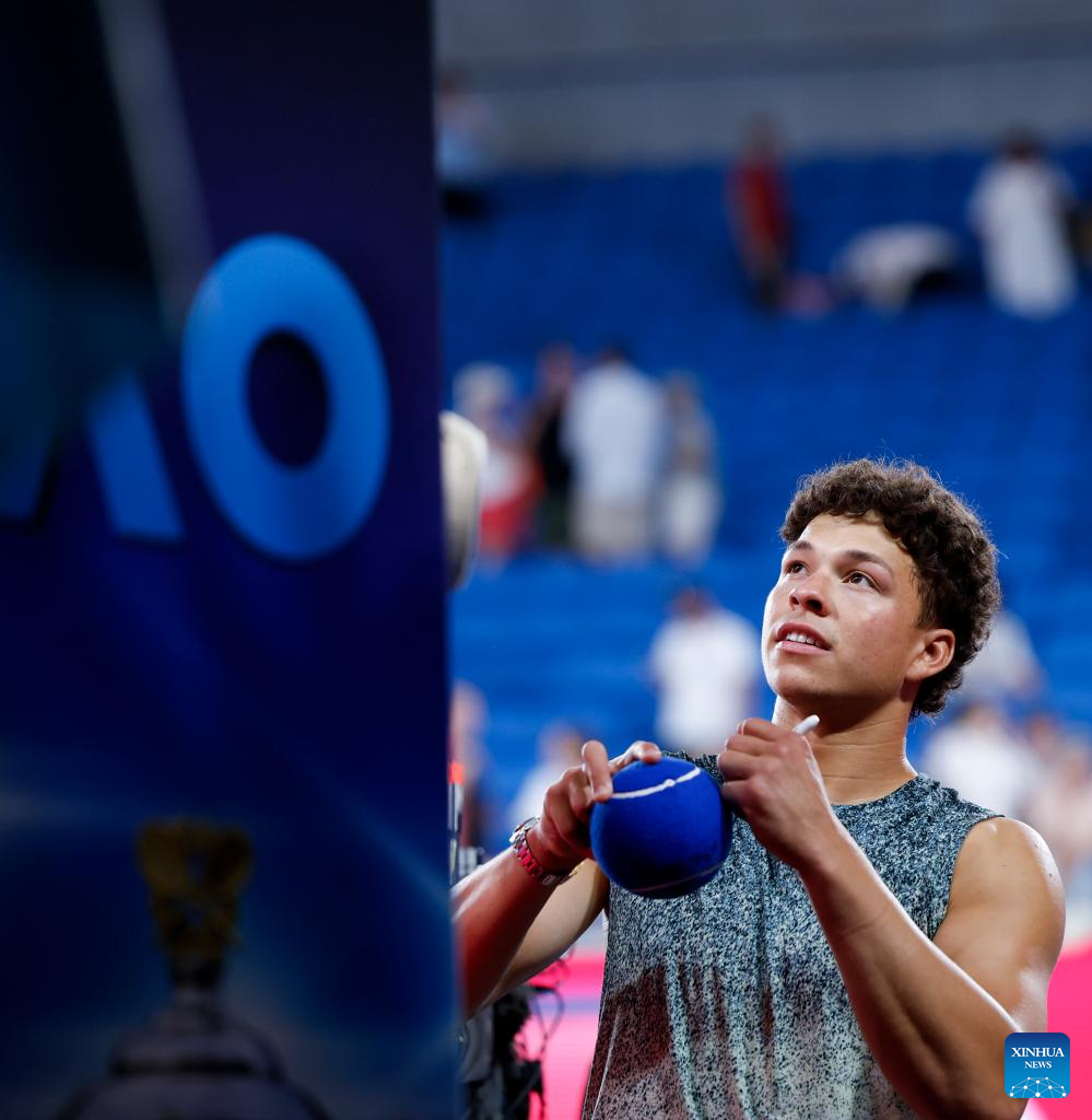 Ben Shelton of the United States interacts with the audience after winning the men's singles 3rd round match against Valentin Vacherot of Monaco at the Australian Open 2026 tennis tournament in Melbourne, Australia, Jan. 24, 2026. (Xinhua/Ma Ping)