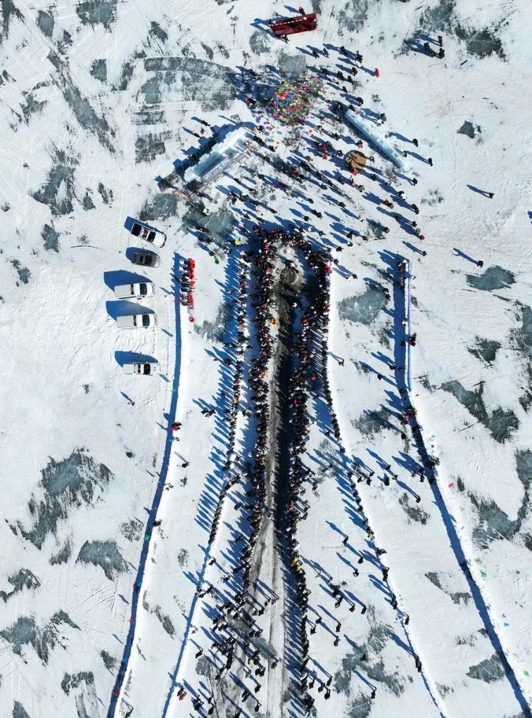 An aerial drone photo taken on Jan. 24, 2026 shows people watching a fish-catching activity at Wolong Lake in Kangping County of Shenyang, northeast China's Liaoning Province. (Xinhua/Li Gang)