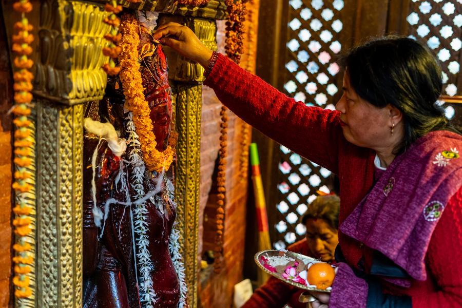 A devotee offers prayers to the Goddess of Knowledge Saraswati in celebration of Basanta Panchami or Shree Panchami festival in Lalitpur, Nepal, Jan. 23, 2026. (Photo by Hari Maharjan/Xinhua)