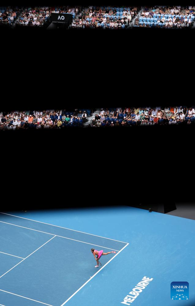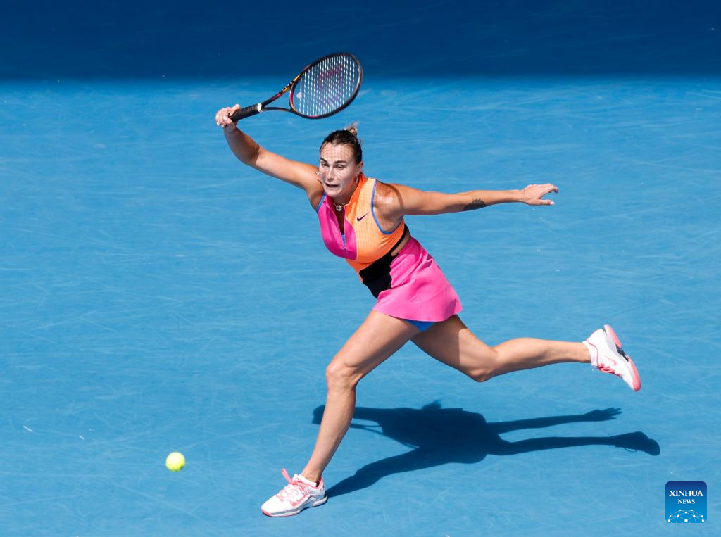 Aryna Sabalenka hits a return during the women's singles 4th round match between Aryna Sabalenka of Belarus and Victoria Mboko of Canada at the Australian Open tennis tournament in Melbourne, Australia, Jan. 25, 2026. (Xinhua/Ma Ping)