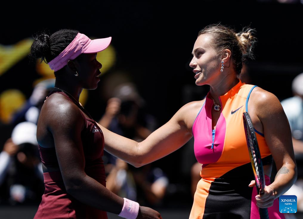 Aryna Sabalenka (R) greets Victoria Mboko after the women's singles 4th round match between Aryna Sabalenka of Belarus and Victoria Mboko of Canada at the Australian Open tennis tournament in Melbourne, Australia, Jan. 25, 2026. (Xinhua/Ma Ping)