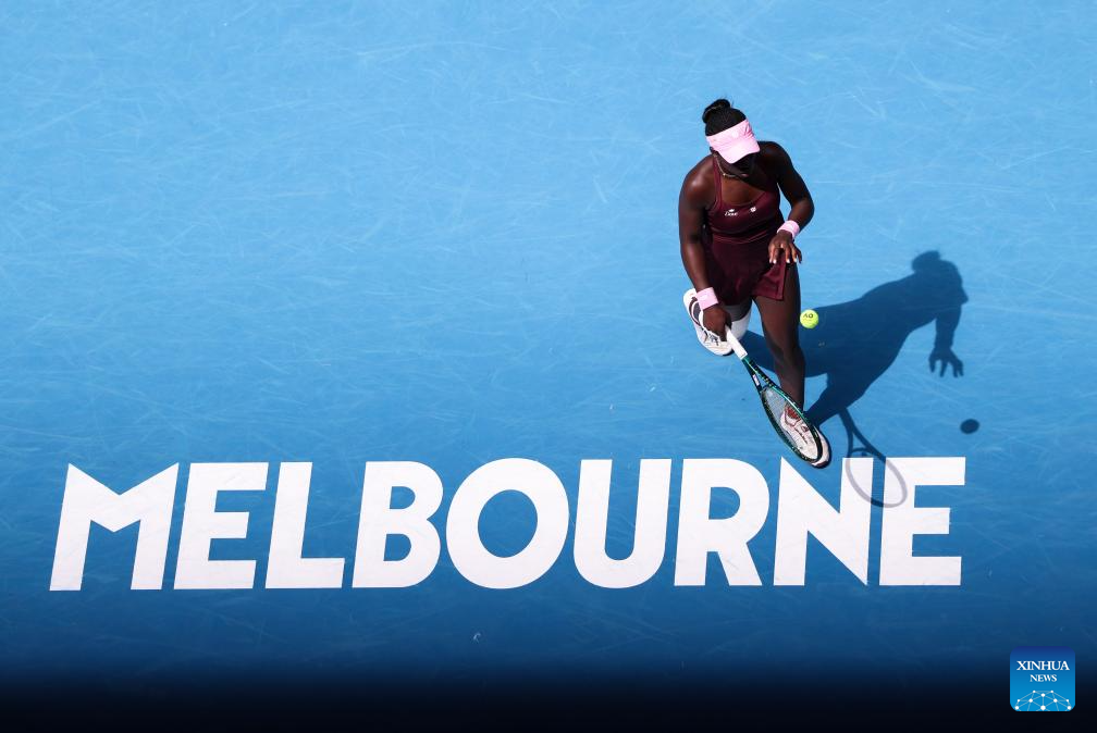 Victoria Mboko prepares to serve during the women's singles 4th round match between Aryna Sabalenka of Belarus and Victoria Mboko of Canada at the Australian Open tennis tournament in Melbourne, Australia, Jan. 25, 2026. (Xinhua/Ma Ping)
