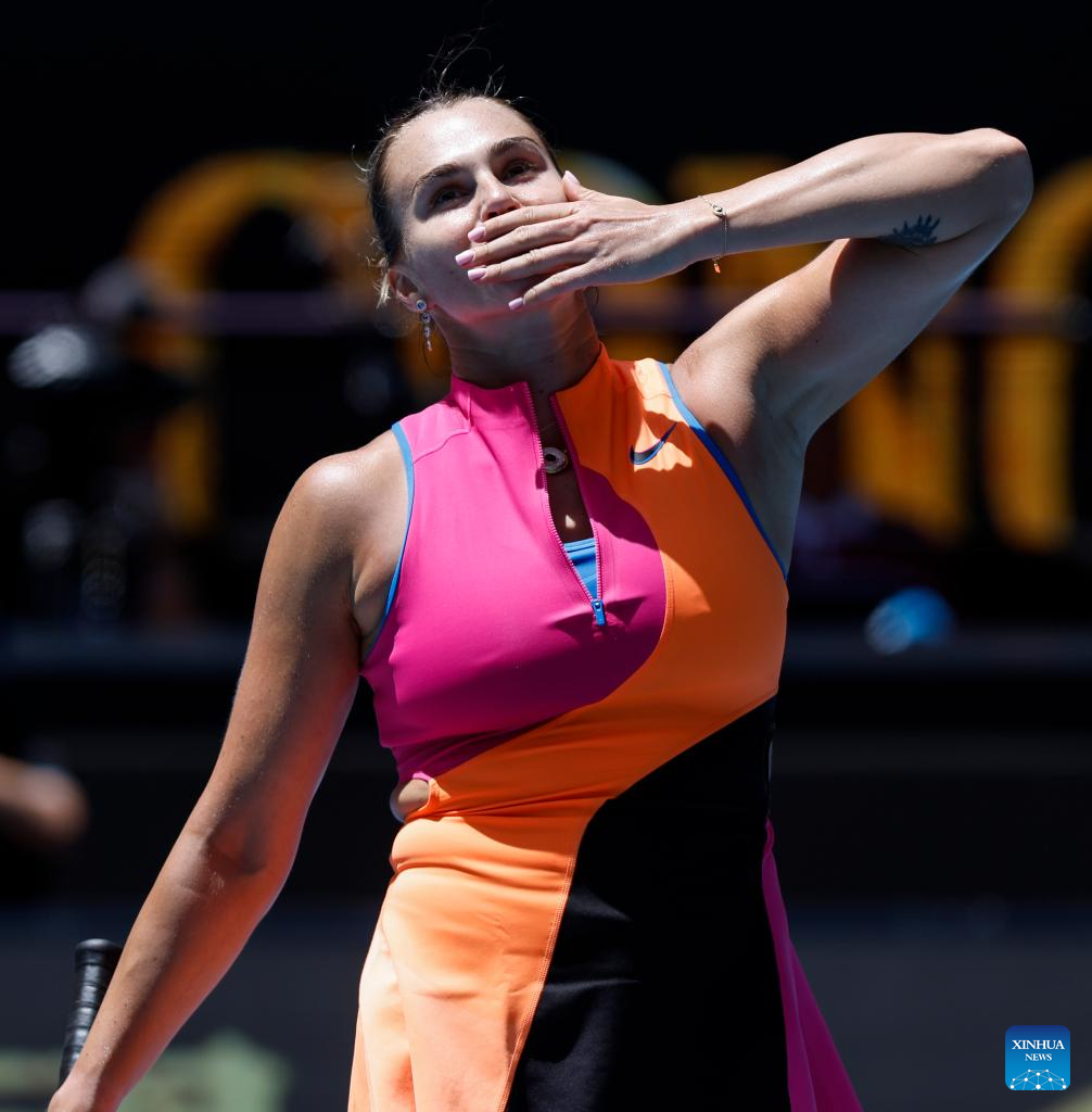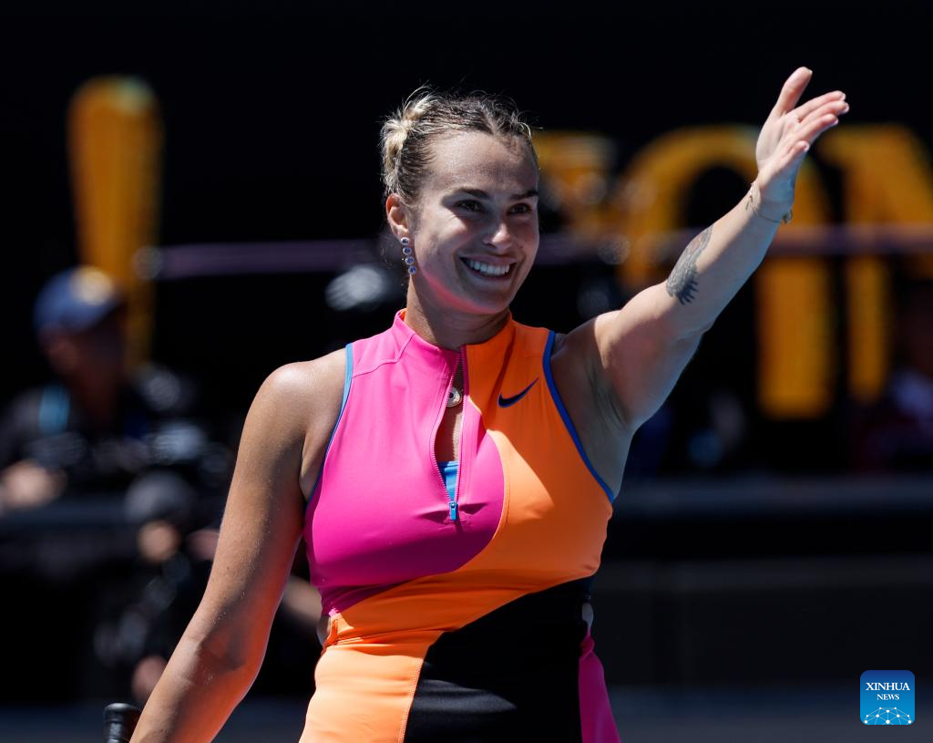 Aryna Sabalenka celebrates victory after the women's singles 4th round match between Aryna Sabalenka of Belarus and Victoria Mboko of Canada at the Australian Open tennis tournament in Melbourne, Australia, Jan. 25, 2026. (Xinhua/Ma Ping)