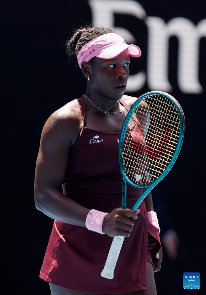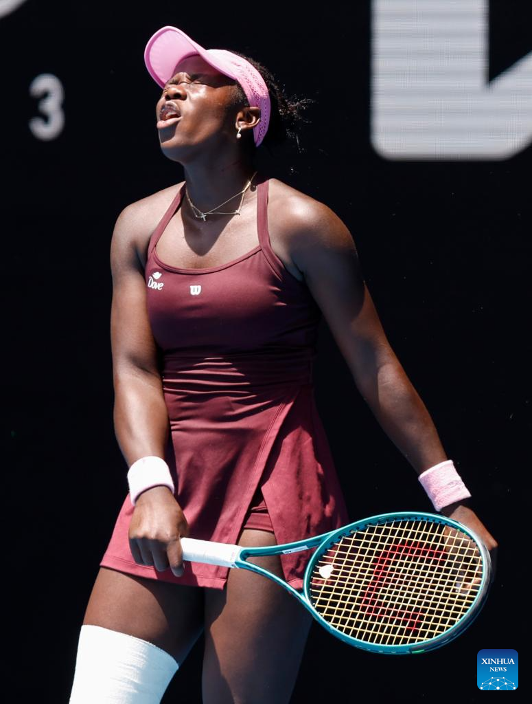 Victoria Mboko reacts during the women's singles 4th round match between Aryna Sabalenka of Belarus and Victoria Mboko of Canada at the Australian Open tennis tournament in Melbourne, Australia, Jan. 25, 2026. (Xinhua/Ma Ping)