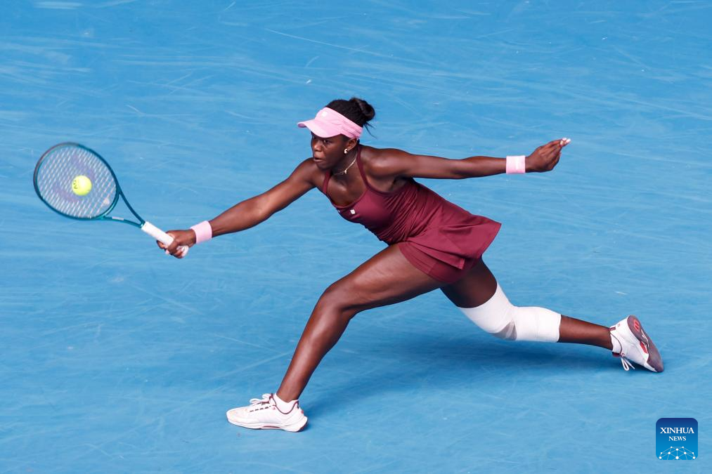Victoria Mboko hits a return during the women's singles 4th round match between Aryna Sabalenka of Belarus and Victoria Mboko of Canada at the Australian Open tennis tournament in Melbourne, Australia, Jan. 25, 2026. (Xinhua/Ma Ping)