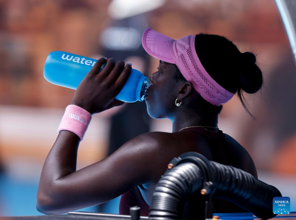 Victoria Mboko drinks water during the women's singles 4th round match between Aryna Sabalenka of Belarus and Victoria Mboko of Canada at the Australian Open tennis tournament in Melbourne, Australia, Jan. 25, 2026. (Xinhua/Ma Ping)