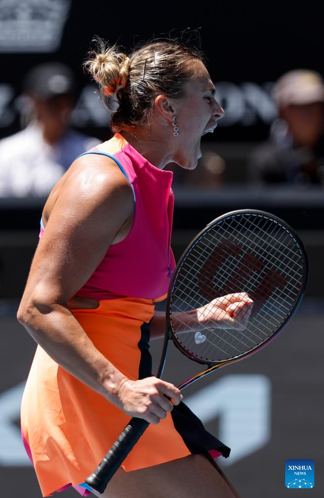 Aryna Sabalenka celebrates scoring during the women's singles 4th round match between Aryna Sabalenka of Belarus and Victoria Mboko of Canada at the Australian Open tennis tournament in Melbourne, Australia, Jan. 25, 2026. (Xinhua/Ma Ping)