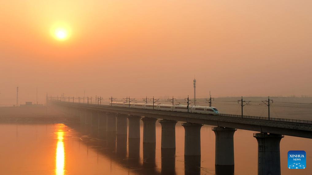 A drone photo taken on Jan. 25, 2026 shows a bullet train running in north China's Tianjin Municipality. A new train schedule will be put into effect in China from Jan. 26. 2026. (Photo by Du Penghui/Xinhua)