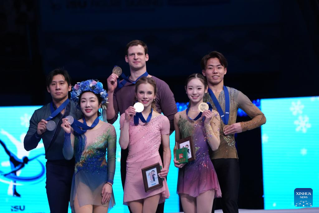 Gold medalists Alisa Efimova (front C)/Misha Mitrofanov (rear C) of the United States, silver medalists Sui Wenjing (2nd L)/Han Cong (1st L) of China, bronze medalists Nagaoka Yuna (2nd R)/Moriguchi Sumitada (1st R) of Japan pose on the podium during the awarding ceremony for the pairs at the ISU Four Continents Figure Skating Championships in Beijing, China, Jan. 24, 2026. (Xinhua/Xie Han)