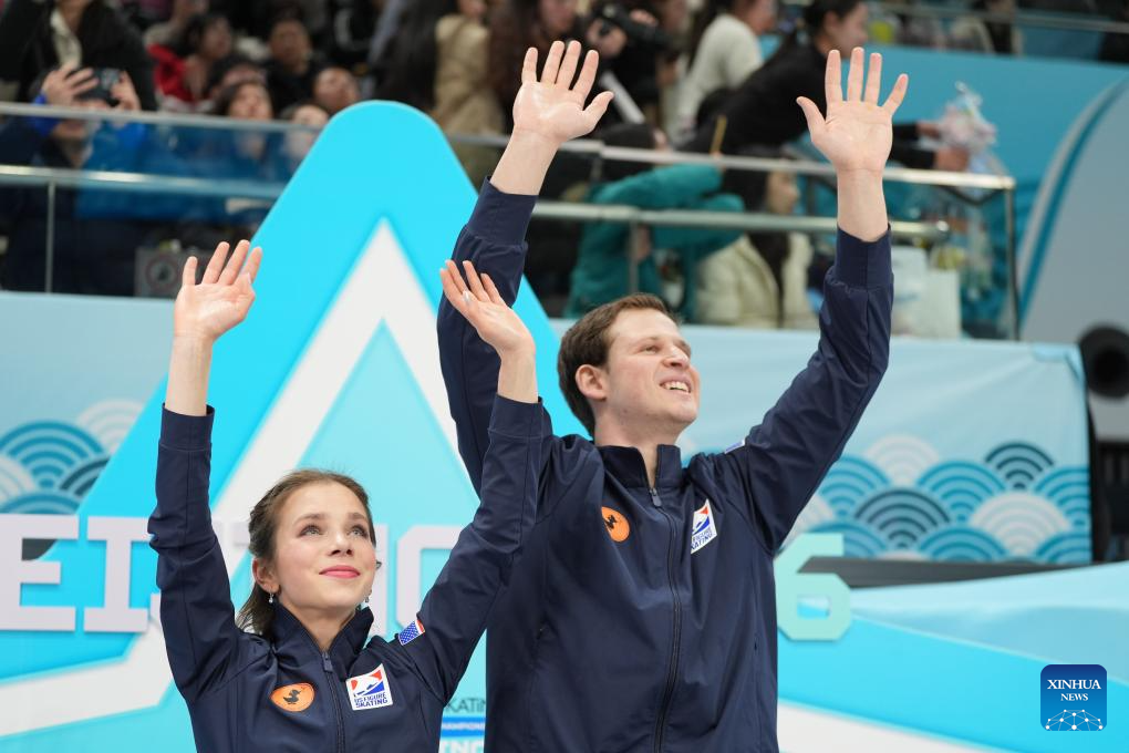 Alisa Efimova (L)/Misha Mitrofanov of the United States wave to spectators after the pairs free skating at the ISU Four Continents Figure Skating Championships in Beijing, China, Jan. 24, 2026. (Xinhua/Xie Han)