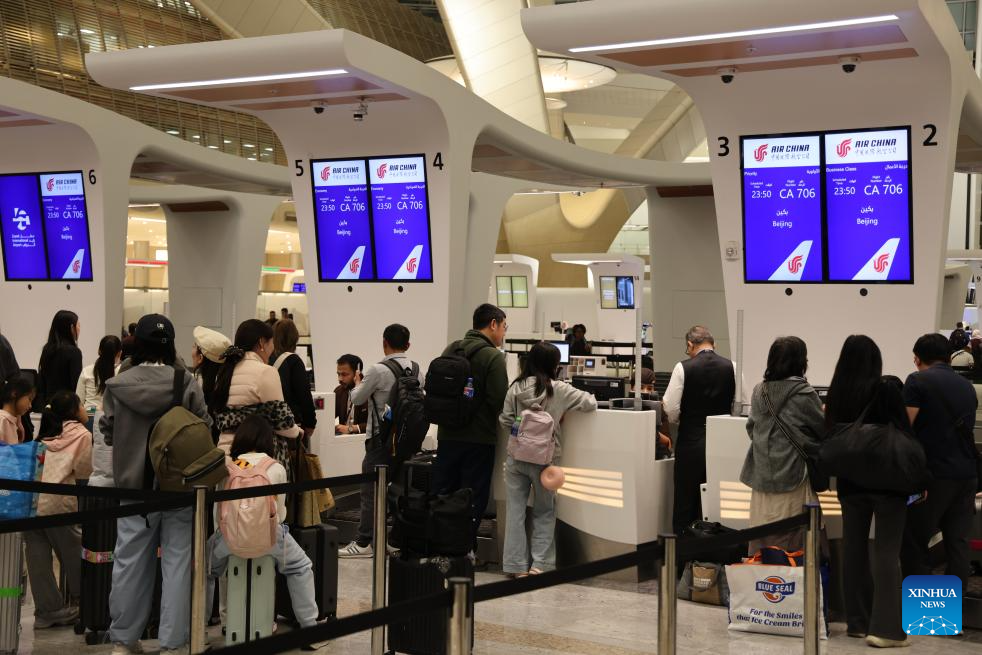 Passengers prepare to board a flight to Beijing at Zayed International Airport in Abu Dhabi, the United Arab Emirates, Jan. 24, 2026. A direct air route between the Chinese capital of Beijing and Abu Dhabi in the United Arab Emirates (UAE) has been launched, marking the first direct connection between the two capitals operated by a Chinese airline. (Xinhua)