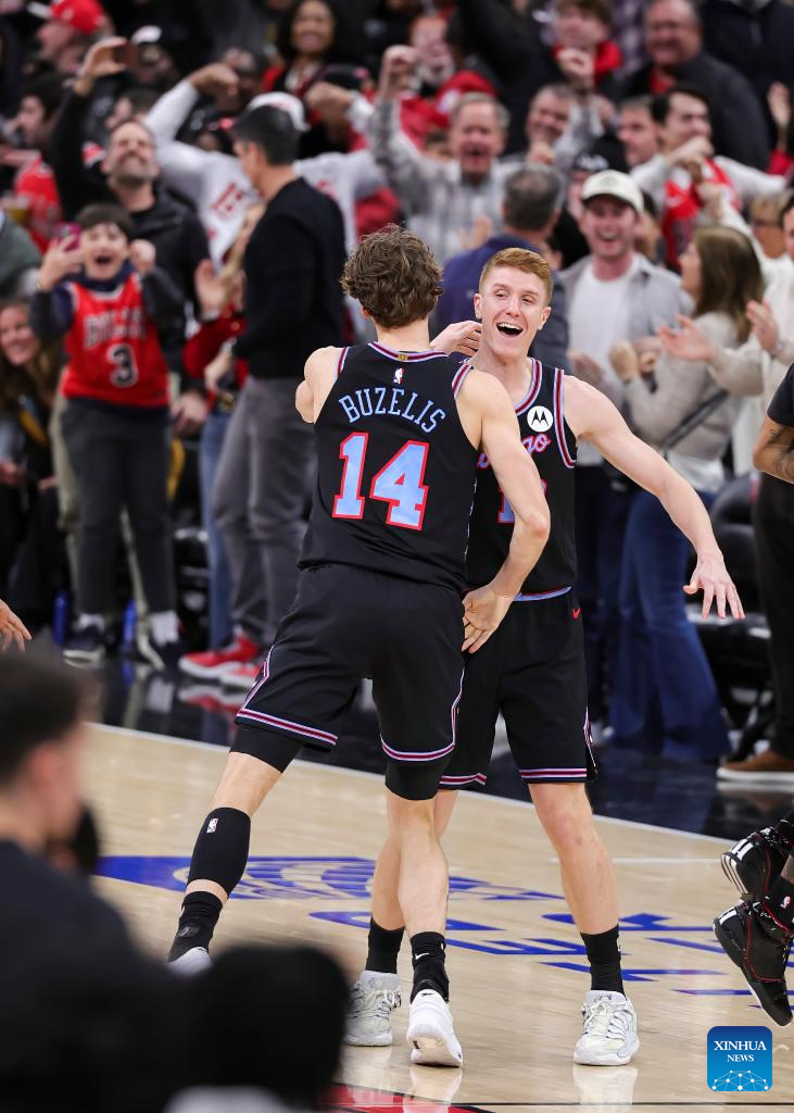 Chicago Bulls' Kevin Huerter (R) celebrates his game winning shot with teammate Matas Buzelis during the 2025-2026 NBA regular season basketball game between Boston Celtics and Chicago Bulls in Chicago, the United States, Jan. 24, 2026. (Photo by Joel Lerner/Xinhua)