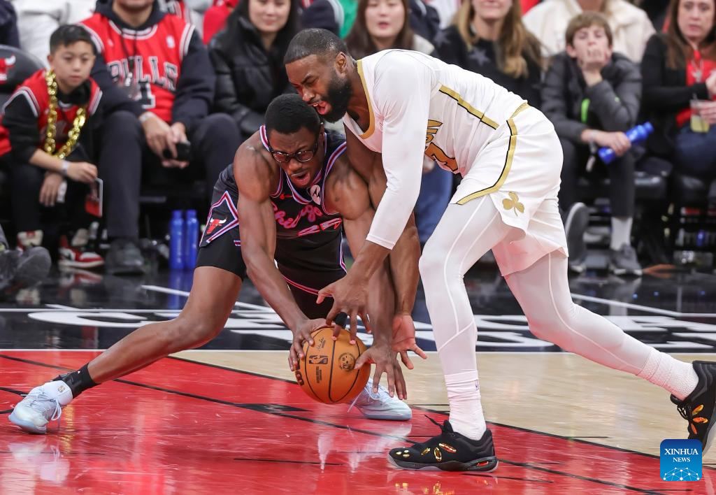 Chicago Bulls' Jalen Smith (L) and Boston Celtics' Jaylen Brown battle for a loose ball during the 2025-2026 NBA regular season basketball game between Boston Celtics and Chicago Bulls in Chicago, the United States, Jan. 24, 2026. (Photo by Joel Lerner/Xinhua)