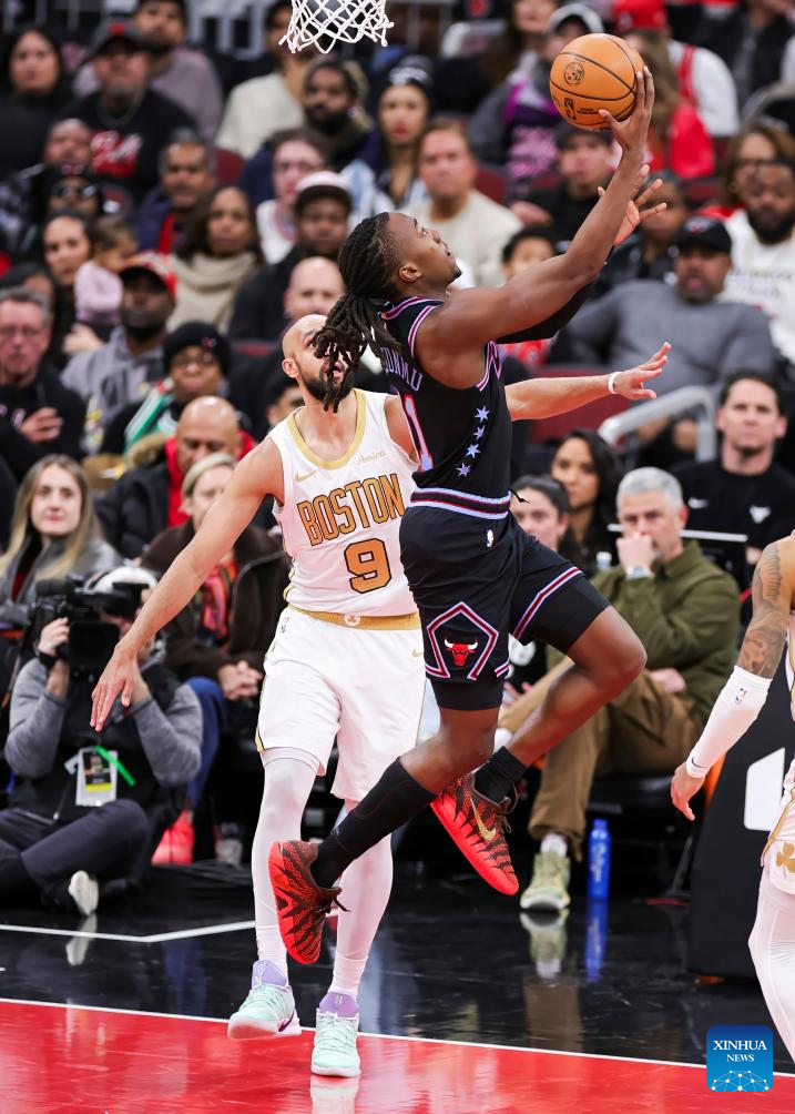 Chicago Bulls' Ayo Dosunmu (R) drives to the basket during the 2025-2026 NBA regular season basketball game between Boston Celtics and Chicago Bulls in Chicago, the United States, Jan. 24, 2026. (Photo by Joel Lerner/Xinhua)