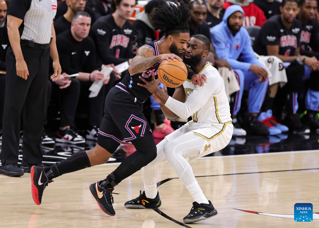 Chicago Bulls' Coby White (L) drives on Boston Celtics' Jaylen Brown during the 2025-2026 NBA regular season basketball game between Boston Celtics and Chicago Bulls in Chicago, the United States, Jan. 24, 2026. (Photo by Joel Lerner/Xinhua)